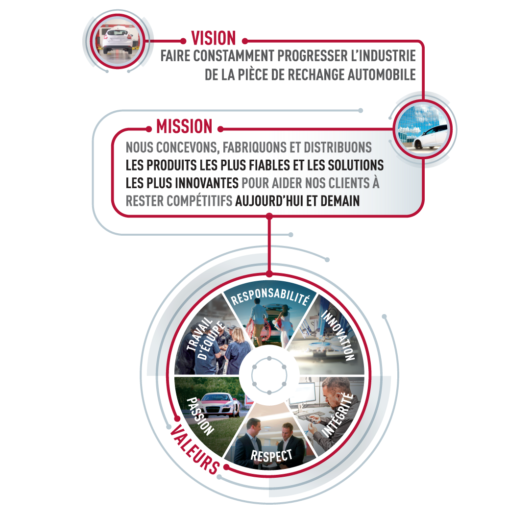 Nous prenons notre vision, notre mission et nos valeurs très au sérieux. Elles nous guident dans notre travail. Notre vision consiste à « remonter la barre » constamment dans l'industrie automobile. Notre mission est de découvrir, de concevoir et de fournir les produits les plus sûrs et les solutions les plus intelligentes pour aider nos clients à gagner, aujourd'hui et demain.