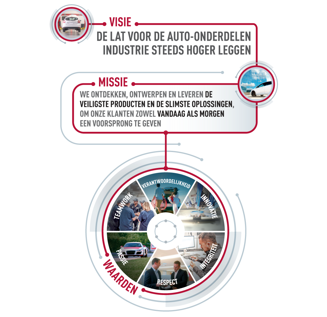 Wij nemen onze missie, visie en waarden serieus. Deze sturen ons bij ons werk. Het is onze visie om de lat voortdurend hoger te leggen in de motoronderdelensector. Het is onze missie om de veiligste producten en slimste oplossingen te ontdekken, ontwerpen en leveren om onze klanten vooruit te helpen, vandaag en in de toekomst.