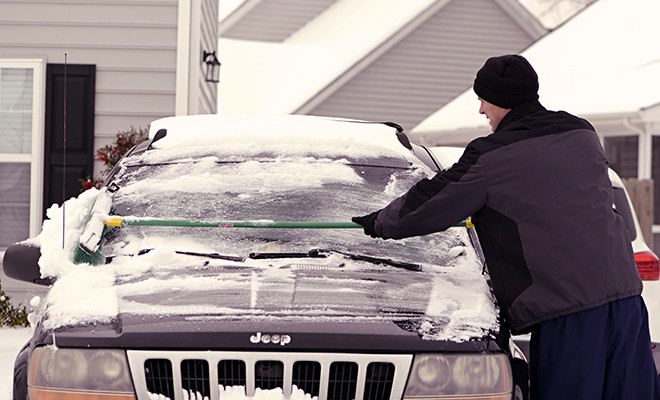 Switch your windshield wiper fluid to a winter version that de-ices your windshield.