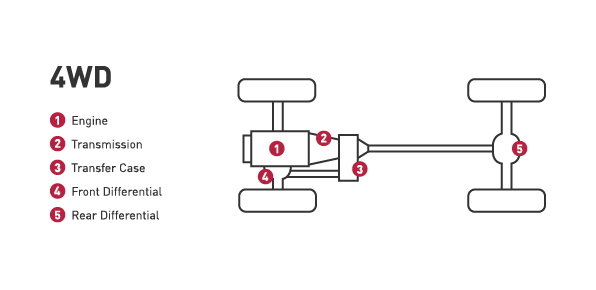 A four-wheel drive system features two driveshafts and a transfer case to deliver power to all four wheels. Today’s 4WD systems are either full-time or part-time. In a full-time system, the vehicle automatically switches between two-wheel and four-wheel drive while a part-time system requires the driver to manually engage the four-wheel drive system. 4WD shines in heavy snow and off-road situations.
