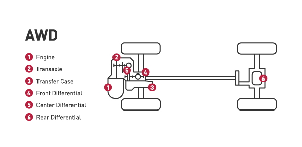 AWD delivers power to all four wheels. Most all-wheel drive systems are always on, using sensors to determine which wheel needs power. However, be aware that systems vary and some all-wheel drive setups stay in two-wheel drive most of the time and only go into all-wheel drive mode when the sensors detect the vehicle is losing traction.