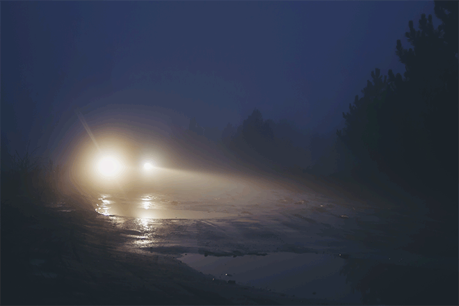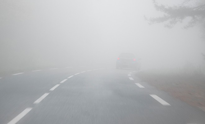 The crisp morning air can cause fog to develop. Fog can appear in low areas and hamper your ability to see oncoming traffic and other things like road signs and traffic lights. Be sure to drive with your low beams and increase the distance between you and other cars.
