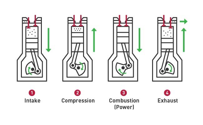 Stroke 3 – Combustion (power): When the piston is at the top, the spark plug fires to ignite the air-fuel mixture. The combustion pushes the piston back down.