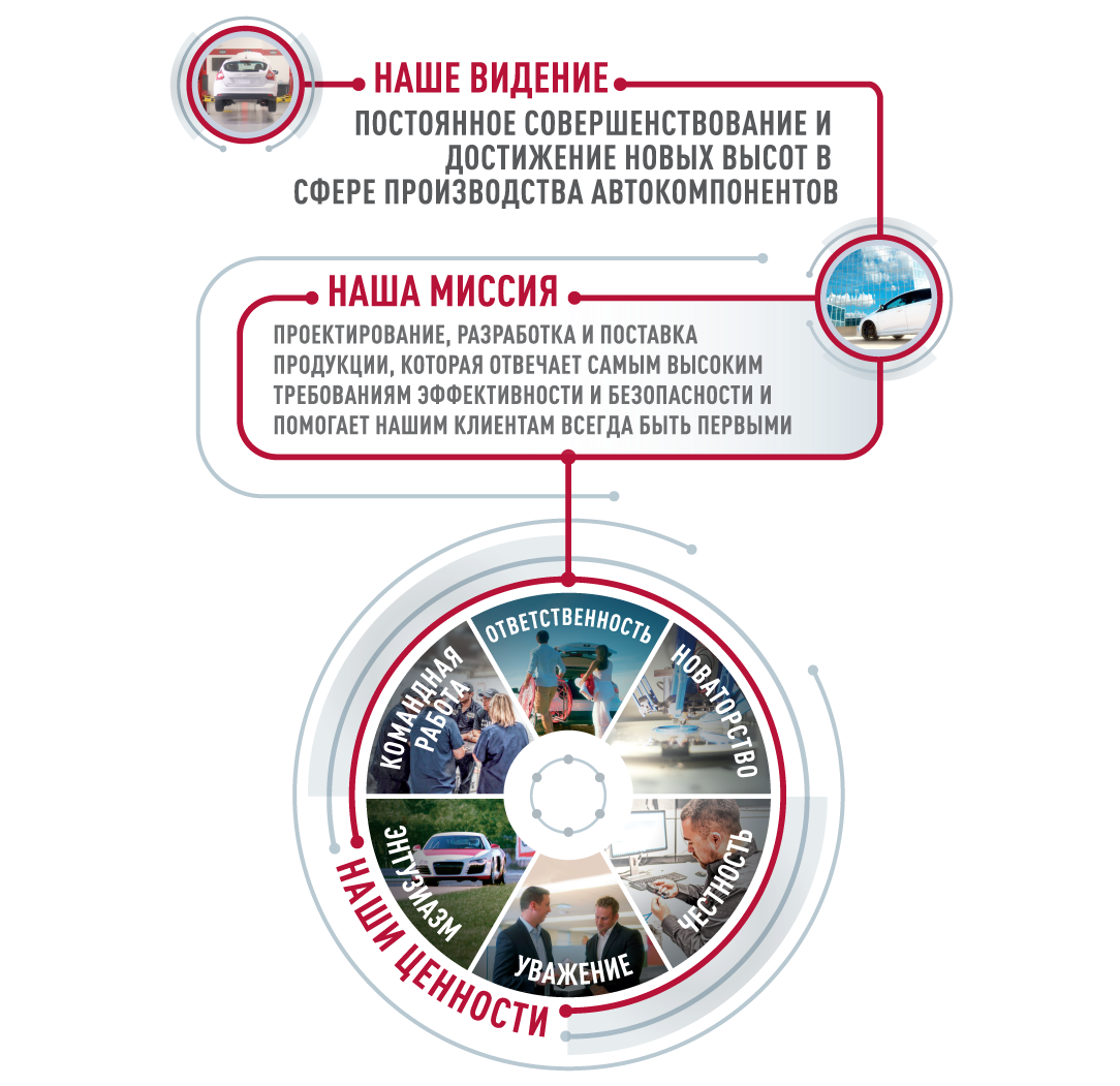 Мы серьезно относимся к нашим миссии, видению и ценностям. Мы руководствуемся ими в нашей деятельности. Наша философия побуждает нас постоянно повышать уровень развития отрасли производства автозапчастей. Наша миссия — открывать, проектировать и поставлять самую безопасную продукцию и продуманные решения, чтобы помогать нашим клиентам быть впереди сегодня и завтра.